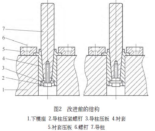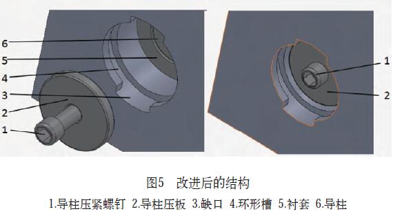 通常在拆卸導(dǎo)柱時(shí),先用內(nèi)六角扳手將導(dǎo)柱壓緊螺釘拆卸、取出導(dǎo)柱壓板,然后用銅棒敲擊導(dǎo)柱下平面,使導(dǎo)柱與襯套分離,取出導(dǎo)柱(見圖1~圖4)。
